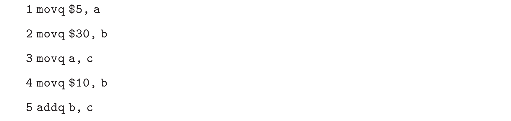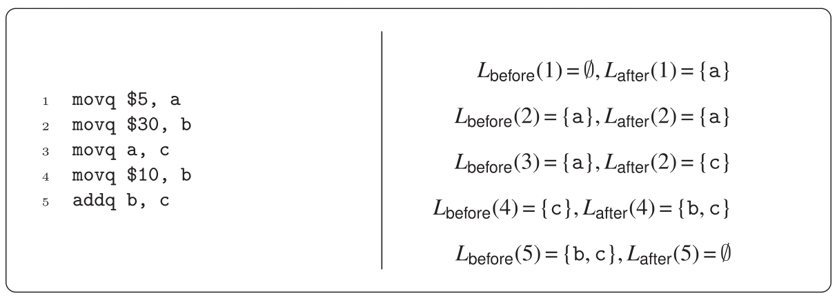 指令movq a, c的live-before集合是{a},因为它写位置{c},并且读位置{a}(公式(3.3))。指令movq$30, b的live-before集合是{a},因为它写一个非活跃变量,并且没有读取变量。最终,指令movq$5, a的live-before集合是∅,因为它写变量a。