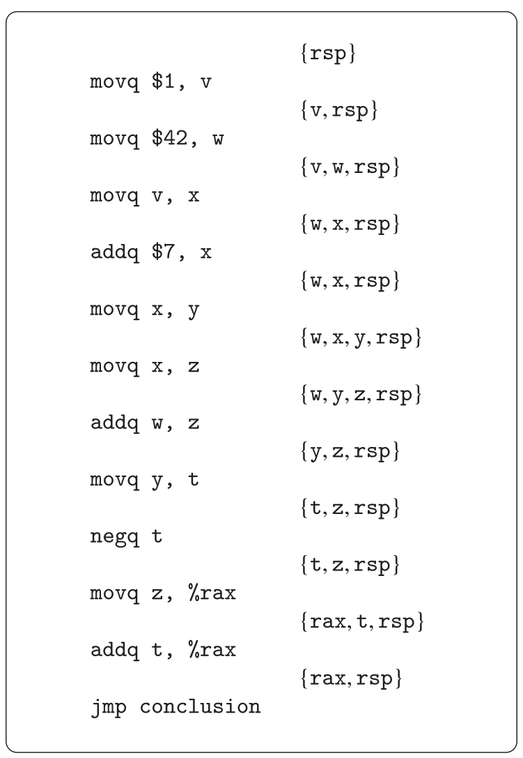 jmp指令有一种特殊情况。在jmp之前活跃的位置应该是 L before 中跳转目标处的位置。因此,我们建议维护一个名为label->live的属性表,将每个标号映射到其块中第一条指令的 L before 。目前,x86 Var 程序中唯一的jmp是跳转到收尾部分(参见图3.1)。收尾部分读取rax和rsp,因此该属性表应该将标号conclusion映射到集合{rax, rsp}。