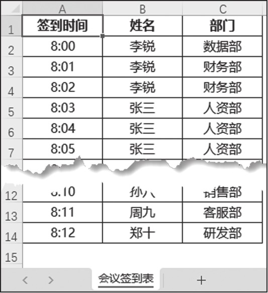 如何快速删除重复值呢?让我们来看一个示例。如图2-10所示,某公司的会议签到表中可能包含重复签到记录(“姓名”和“部门”同时重复),工作人员希望批量清除这些包含重复值的记录行。这种需求可以利用Power Query的数据清洗功能轻松实现。