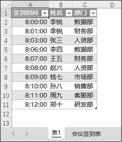 4)上载回Excel工作表的“表1”中已经清除了重复签到记录,显示效果如图2-14所示。