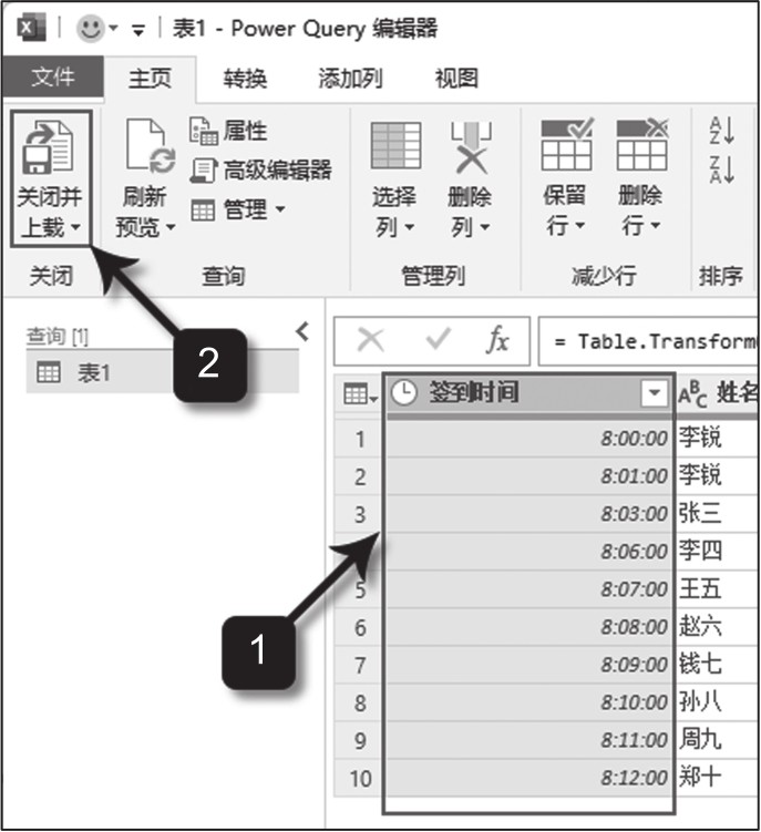 3)在Power Query编辑器中检查结果无误后,单击“关闭并上载”按钮,将结果上载回Excel工作表,如图2-13所示。