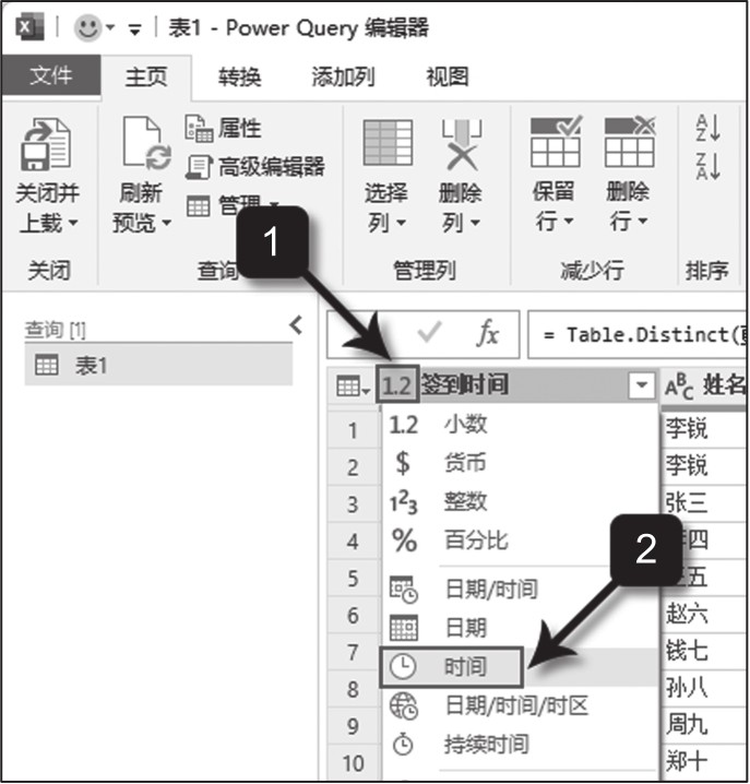 2)经过检查可以发现,Power Query编辑器中“签到时间”的格式变为小数了,所以需要将该值设置为时间格式,操作步骤如下:单击“签到时间”字段左侧的扩展按钮,在展开的下拉菜单中单击“时间”选项,将“签到时间”的数据格式调整为时间格式,如图2-12所示。