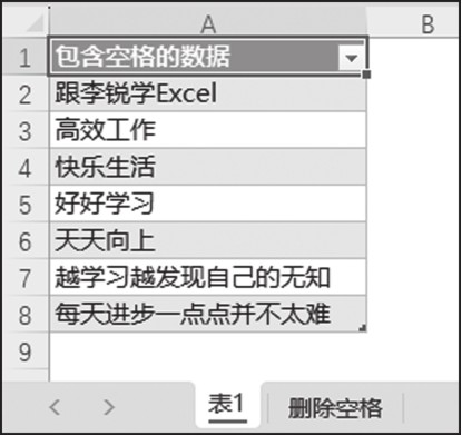 3)如图2-18所示,可以看到,Excel工作表的“表1”中已经不包含任何空格了。即使后续工作中数据源中新增了包含空格的数据,用户只需刷新“表1”即可一键清除多余空格。