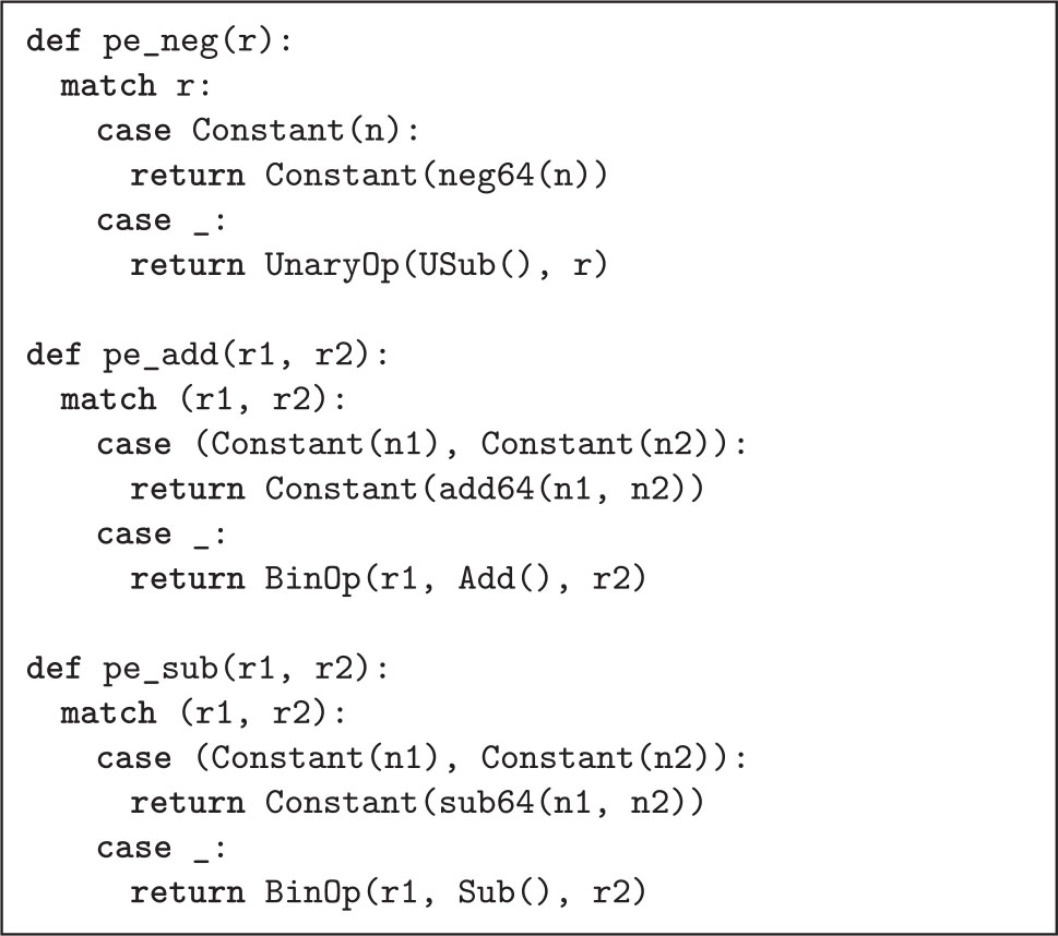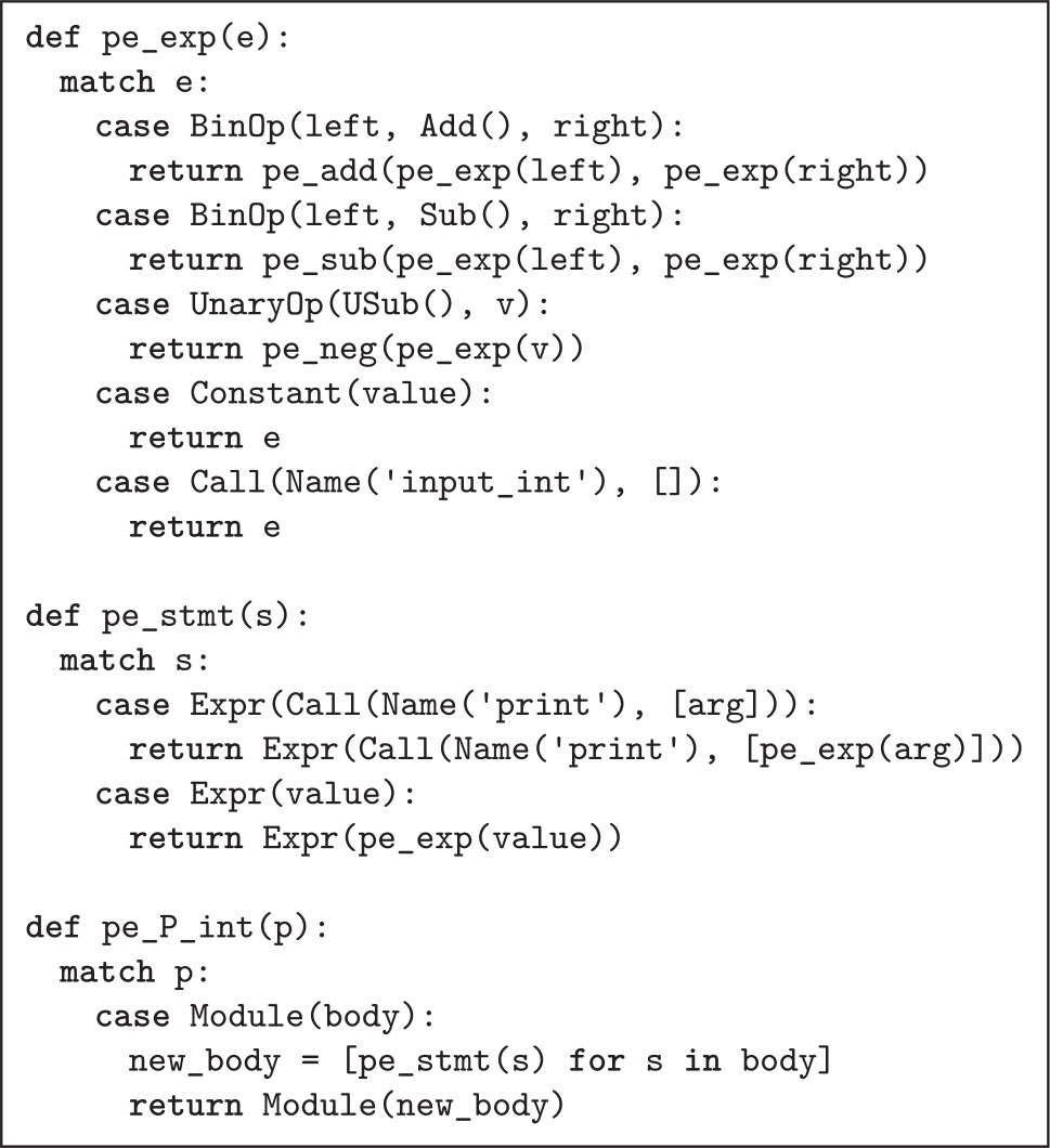 图1.5给出了 L Int 语言的一个简单的部分求值器的代码。部分求值器的输出是 L Int 语言中的程序。在图1.5中, exp 上的结构化递归是在pe_exp函数中捕获的,而部分取负和加法操作的代码则分解到三个辅助函数中:pe_neg、pe_add和pe_sub。这些函数的输入是子函数部分求值的输出。pe_neg、pe_add和pe_sub三个函数检查它们的参数是否为整数,如果是整数,则执行相应的算术操作;否则,它们将为算术运算创建AST节点。