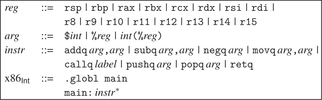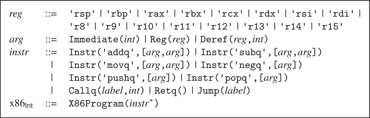 我们的编译器需要一种方便的表示来操作x86程序,因此我们为x86定义了一种抽象语法,如图2.9所示,我们把这种语言称为x86 Int 。它与x86 Int 的具体语法(图2.5)的主要区别在于标签、指令名和寄存器名是由字符串显式表示的。关于callq的抽象语法,Callq的AST节点包含一个整数,用于表示函数的元数,即其参数的数量,知道该值将有助于后面寄存器的分配(见第4章)。