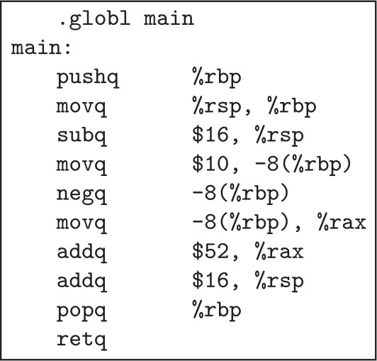 起始处理之后的第一条指令是movq $10,-8(%rbp),它将值10存储在变量1中。指令negq-8(%rbp)会将变量1的内容更改为-10。下一条指令将变量1中的-10移到rax寄存器中。最后,addq $52, %rax将52加到rax中的值上,将其内容更新为42。