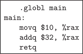 x86 Int 汇编语言的具体语法的定义如图2.5所示。我们使用GNU汇编器所使用的AT&T语法。程序以一个main标签开始,后面跟着一串指令。globl指令使主过程在外部是可见的,以便操作系统可以调用它。x86的程序存储在计算机的内存中。就我们的目的而言,计算机的内存可被看作64位地址到64位值上的映射。计算机在rip寄存器中有一个 程序计数器 (PC),它指向下一条要执行的指令的地址。对于大多数指令,程序计数器在指令执行后递增,以便指向内存中的下一条指令。大多数x86指令接受两个操作数,每个操作数可能是一个整数常量(称为 立即值 )、一个 寄存器 或一个内存位置。