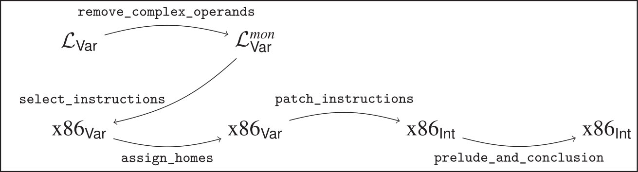图2.10给出了编译器各编译遍的执行顺序,并标识了每遍的输入和输出语言。select_instructions遍的输出是x86 Var 语言,它使用无限作用域变量来扩展x86 Int 语言,并删除指令参数限制。最后一个是prelude_and_conclusion遍,将程序指令放入一个带有起始和收尾指令的main函数中。本章的剩余部分中提供了图2.10所示的编译器进行的各遍的实现指南。