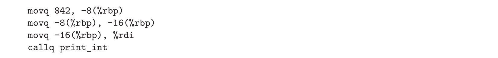 patch_instructions编译遍将从x86 Var 语言翻译到x86 Int 语言,确保每条指令都遵守一条指令最多只能有一个参数是内存引用的限制。