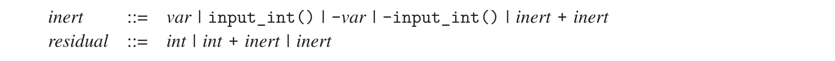 要做到这一点,pe_exp函数应该以下面语法的非终结符 residual 的形式产生输出。其思想是,在处理加法表达式时,我们总是可以生成以下情况之一:整数常数,左边有整数常数但右边没有整数常数的加法表达式,或者两个子表达式都不是常数的加法表达式。