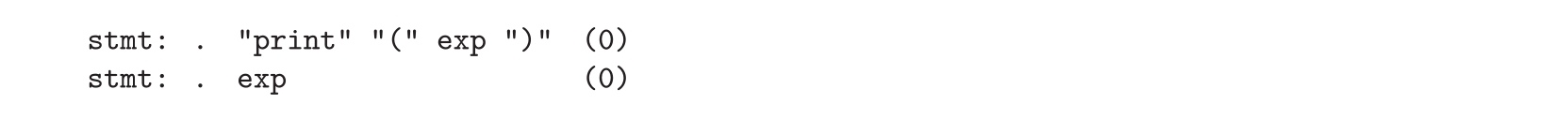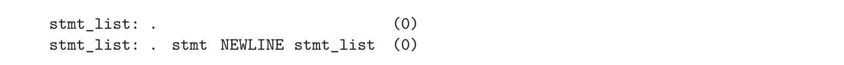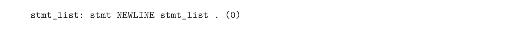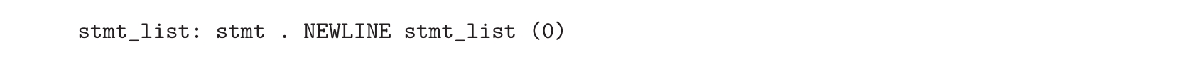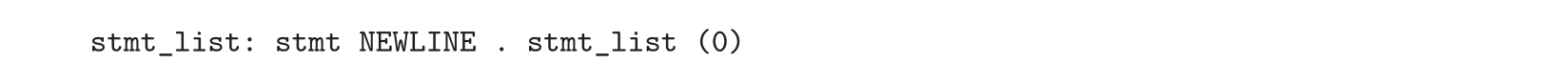 放置在图表的槽0中。然后,该算法继续进行预测操作,根据句点后立即出现的非终结符,在图表中添加更多的带点规则。在上面的带点规则中,非终结符stmt_list出现在句点之后,因此我们将stmt_list的所有规则添加到槽0中,在这些规则的右部的开头有一个句点,如下所示: