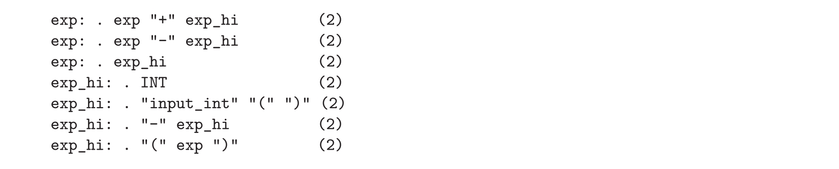 现在,在句点后面紧跟着一个非终结符,所以需要执行几个预测操作,将exp和exp_hi的带点规则添加到槽2中,句点在规则的开头,规则的起始位置为2。