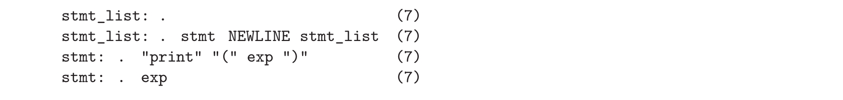 随着更多机会的出现,我们继续预测行动。例如,现在非终结符stmt出现在句点之后,因此stmt的所有带点规则会被添加进来。