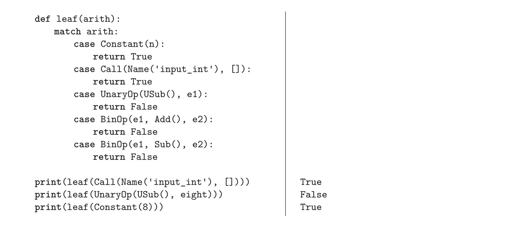 在构造match表达式时,我们参考语法定义来确定希望匹配哪个非终结符,然后确保:该非终结符的每种选择都有一个匹配的情形,每种情形中的模式对应于语法规则的相应右侧。以leaf函数中的match为例,根据图1.2中所示的 L Int 语法, exp 非终结符有5个备选项,因而对应的match项有5种情形,每种情形下的模式对应于语法规则的右侧。例如,模式BinOp(e1, Add(), e2)对应于右侧的BinOp( exp , Add(), exp )。在将语法转换为模式时,需用所选择的模式变量(如e1和e2)替换 exp 等非终结符。