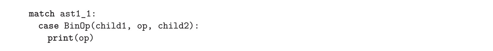 编译器经常需要访问AST节点的各个部分,如1.1节所述。从3.10版本开始,Python提供了match特性来访问各个部分的值。参考示例如下: