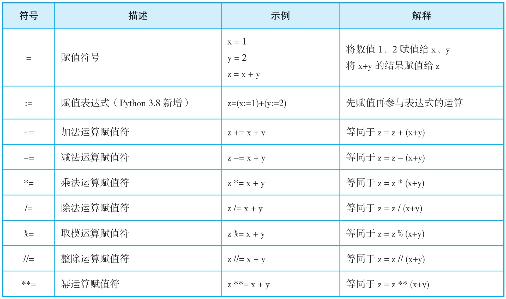 Python的赋值符号除了“=”以外,还包括:=、+=、-=、*=、/=、%=、//=和**=,如表1-3-2所示。