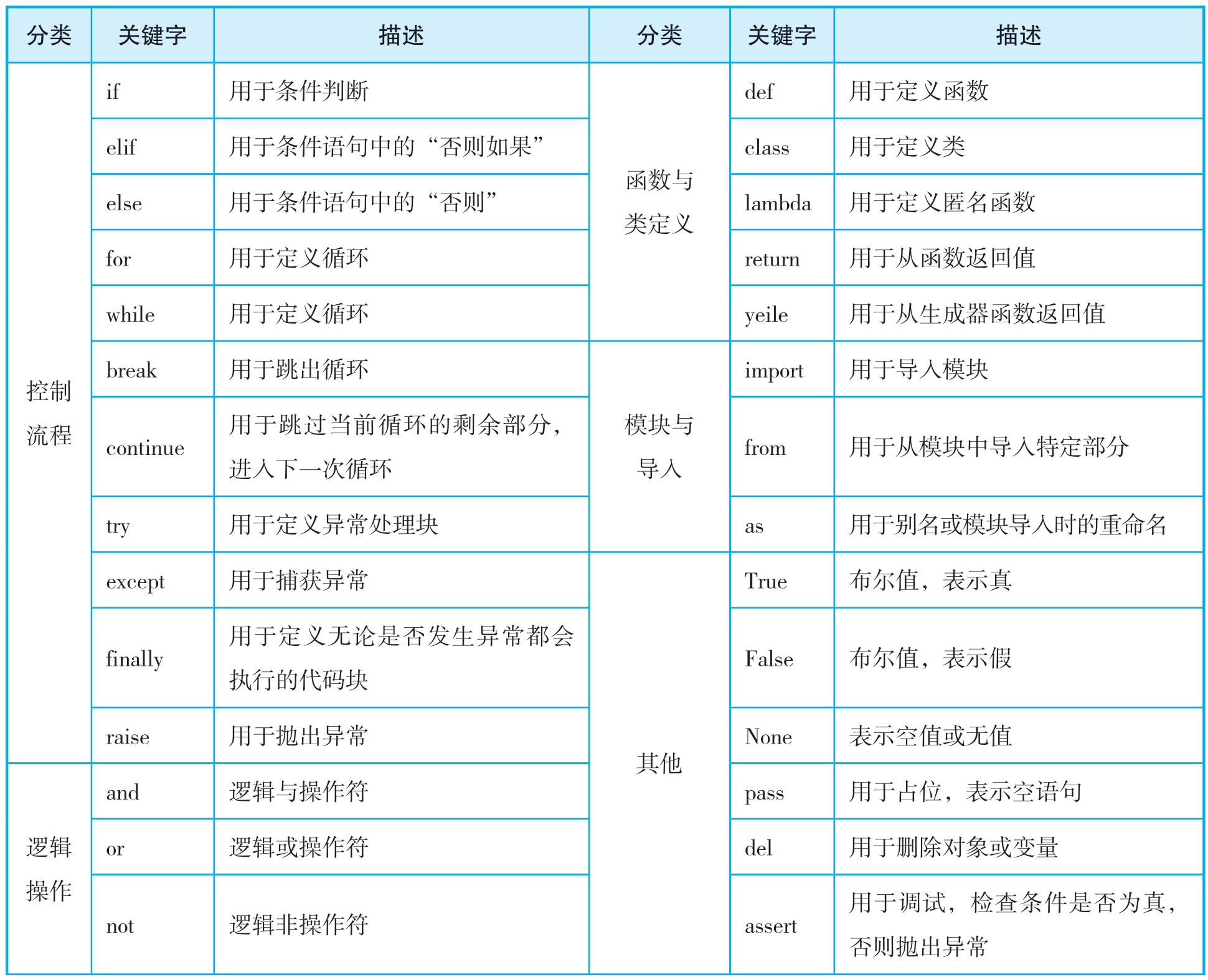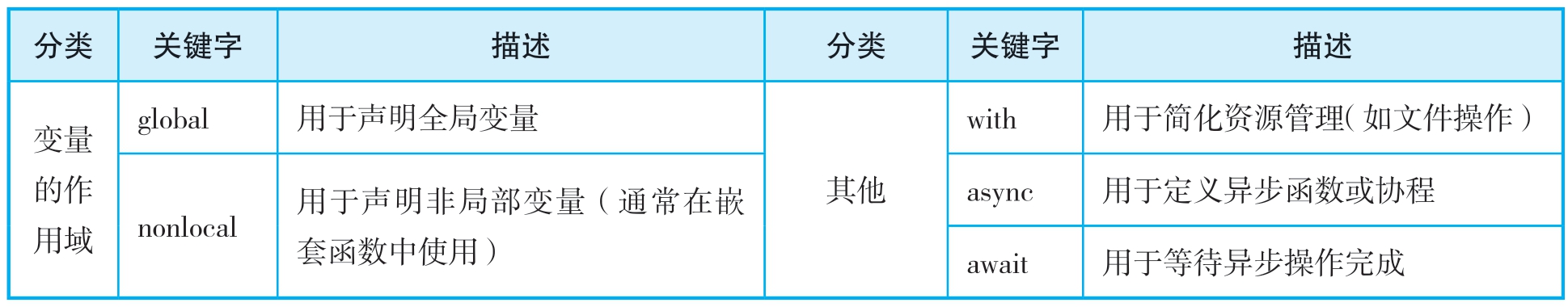 Python 3.x版本中的所有关键字(共35个)的作用分类及其具体用途如表1-3-1所示。