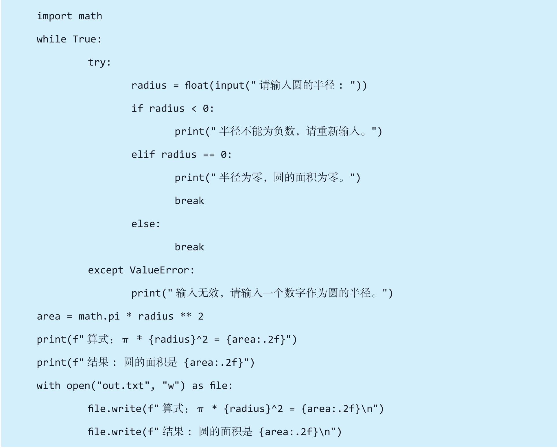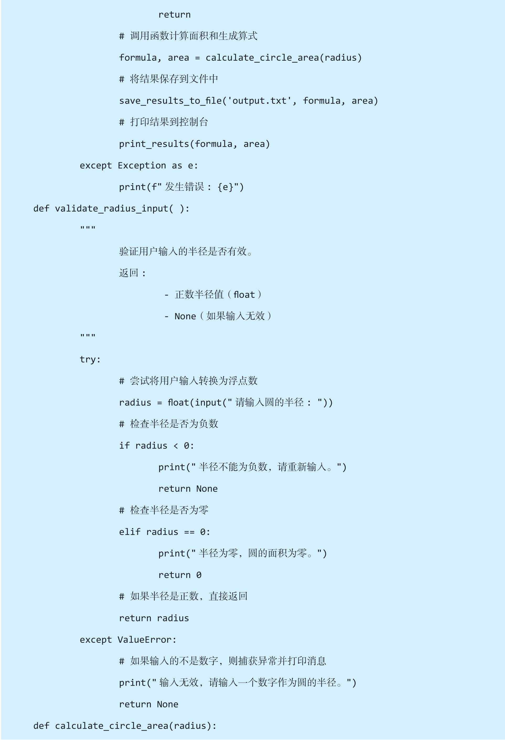 上述代码较长,主要是因为将计算圆面积的每个功能模块都用函数实现(如验证输入半径的有效性、将结果保存到文件等),并为每个函数和主要代码行添加了详细的注释。这种写法虽然代码量较大,但结构清晰、易于维护和扩展。