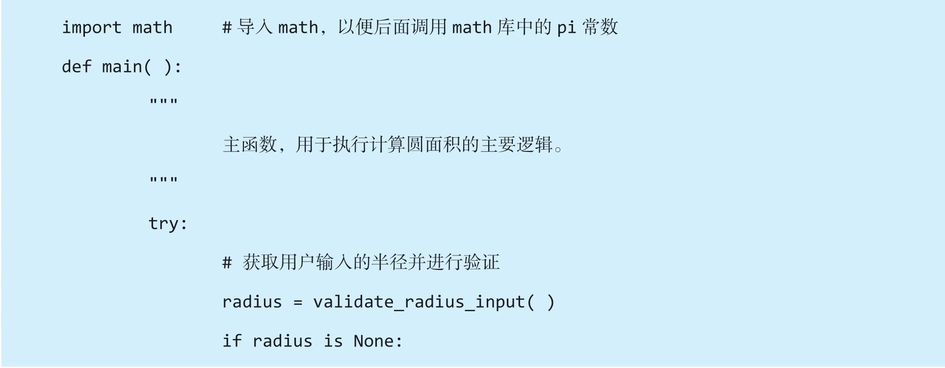 如果不需要模块化和注释,代码可以简化为以下形式,直接实现圆面积的计算。