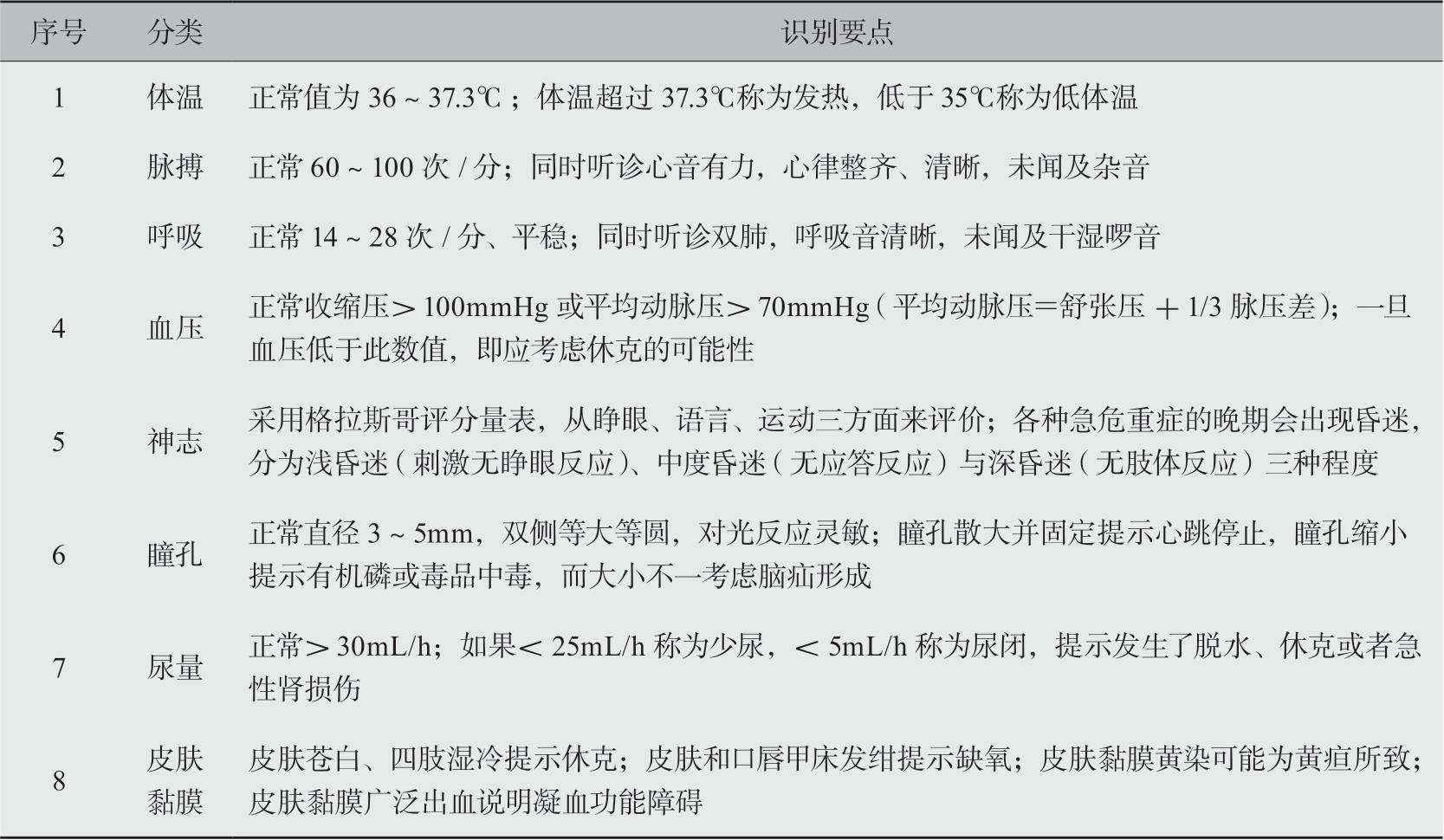 通过对生命“八征”的重点检查,来快速识别患者是否属于急危重症(表2-6)。