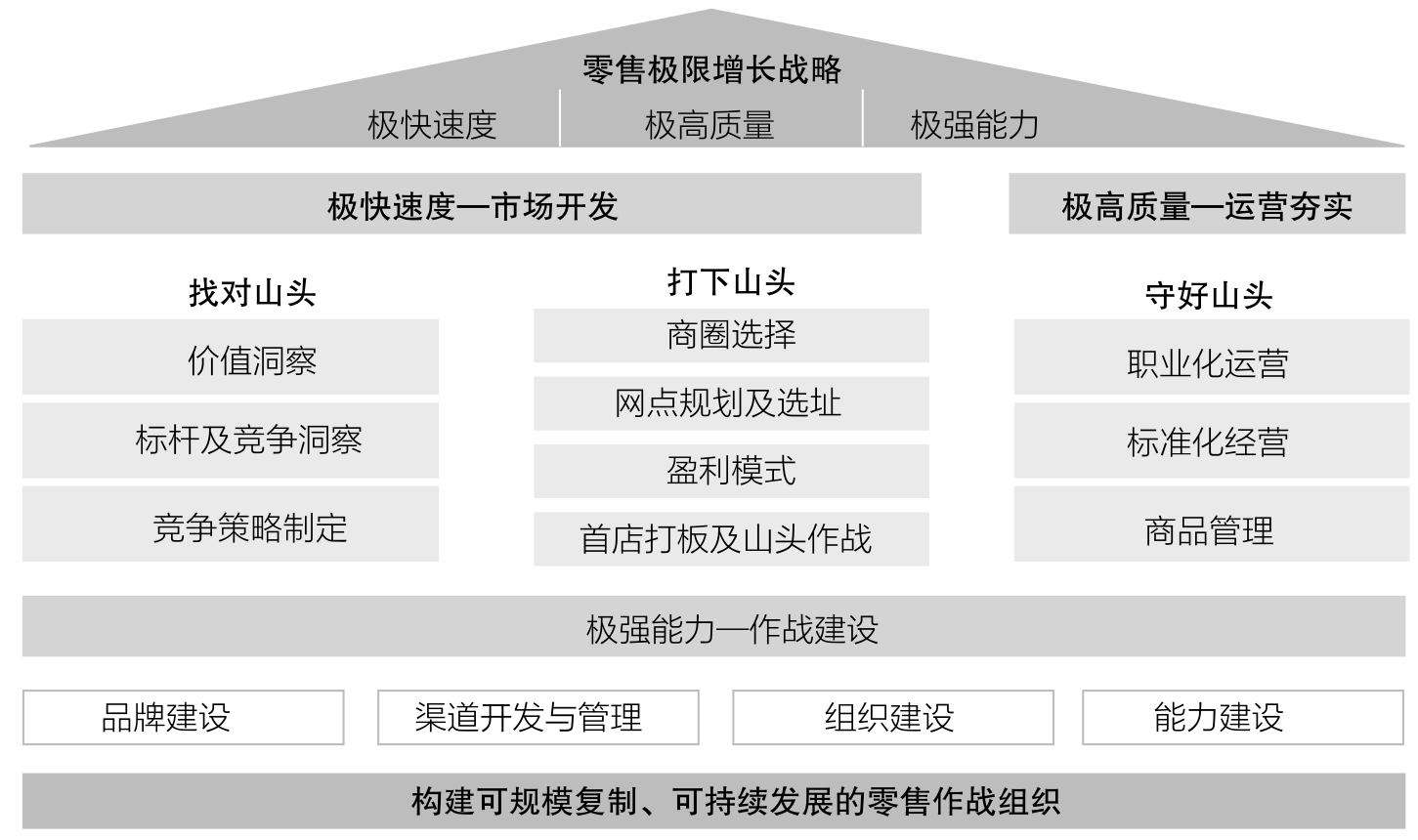 总体而言,零售极限增长战略就是以极快速度、极高质量、极强能力为目标,从零售极限战略的规划、零售作战地图的绘制、具体攻山头的组织和计划,到个体门店的职业化运营、标准化经营及做好商品管理,同时不断强化品牌、渠道、组织作战能力建设,构建一个可规模复制、可持续发展的流程化作战组织。