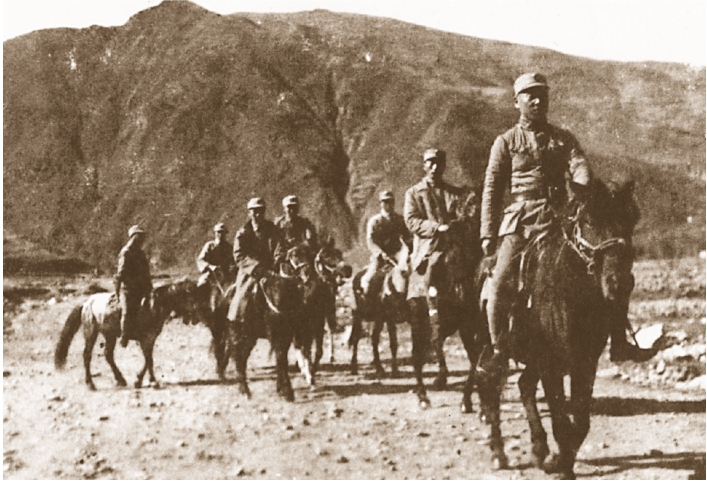 第115师师长林彪(前)、副师长聂荣臻(第二人)率部向敌后挺进