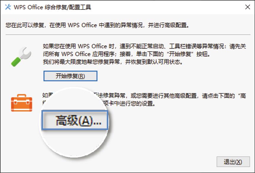 2 在弹出的【WPS Office综合修复/配置工具】对话框中单击【高级】按钮。