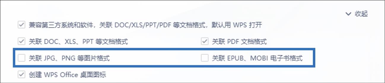 WPS Office具有强大的兼容性,安装时它也会自动关联JPG/PNG等图片格式、EPUB/MOBI等电子书格式,默认使用WPS Office打开它们。如果希望这些文件沿用原有的打开方式,则需要取消相关复选框的勾选。