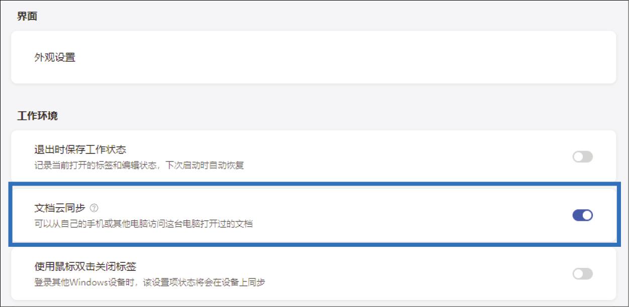 2 在弹出的对话框中打开【文档云同步】右侧的开关。