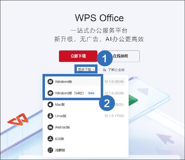 2 在网站首页找到红色的“WPS Office”模块,单击【更多下载】按钮,在弹出的菜单中选择合适的版本进行下载。这里以“Windows版”为例进行演示。