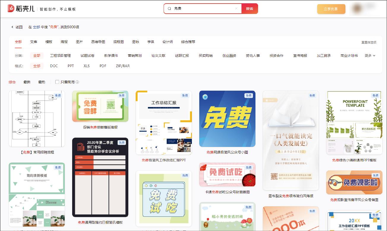2 在页面的搜索框中输入“免费”,即可找到稻壳儿网中所有的免费模板(右上角有“免费”标识)。