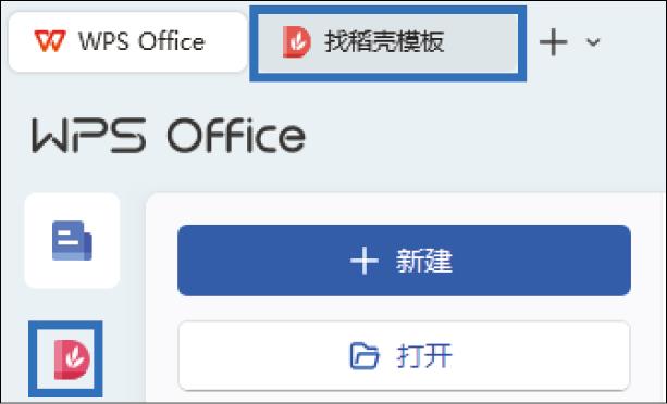 1 打开WPS Office后,单击窗口上方的【找稻壳模板】标签或单击左侧工具栏中的【稻壳】图标,即可跳转访问稻壳儿网。