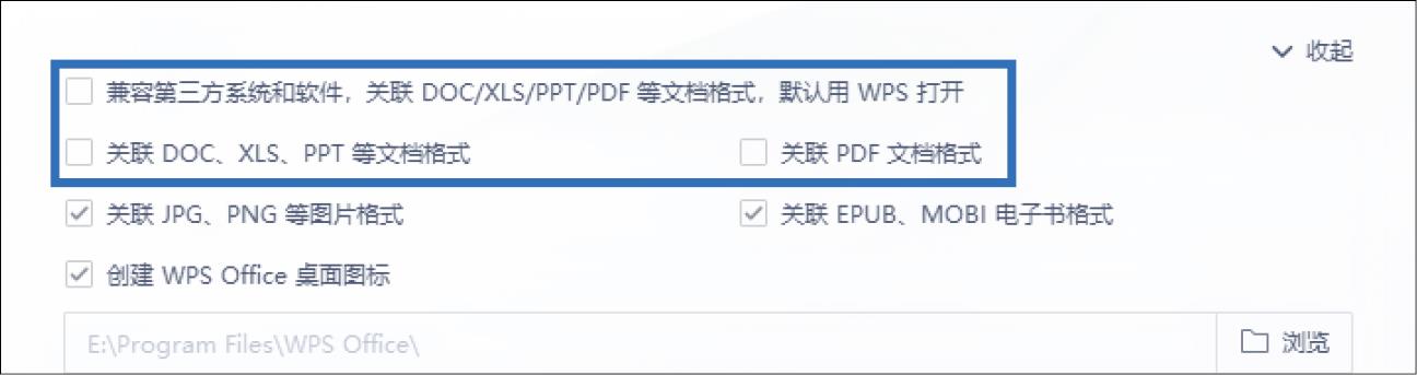 安装的时候,计算机会将系统默认的办公软件修改为WPS Office。如果用户希望保持原有的办公软件的默认设置,则需要取消勾选【兼容第三方系统和软件……】、【关联DOC、XLS、PPT等文档格式】和【关联PDF文档格式】复选框。