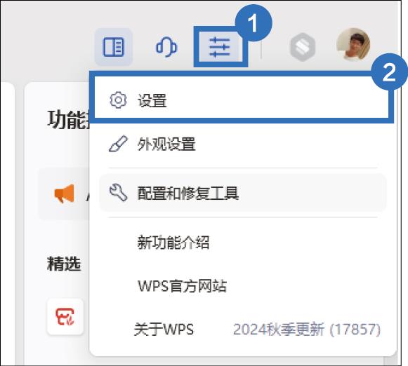 1 打开WPS Office后,在窗口右上方单击【全局设置】按钮,在弹出的菜单中选择【设置】命令,在弹出的对话框中选择【文件格式关联】选项。