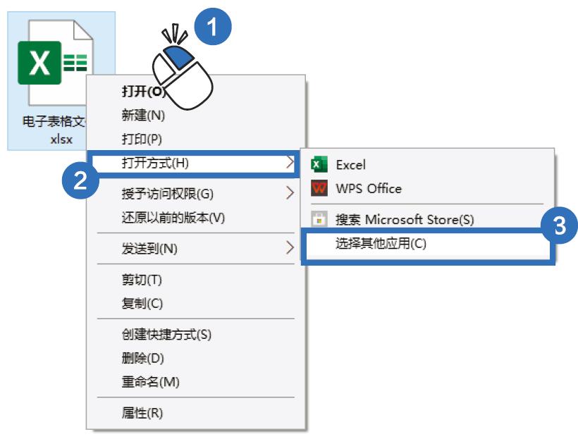 1 右键单击任一电子表格文件,在弹出的菜单中选择【打开方式】-【选择其他应用】命令。