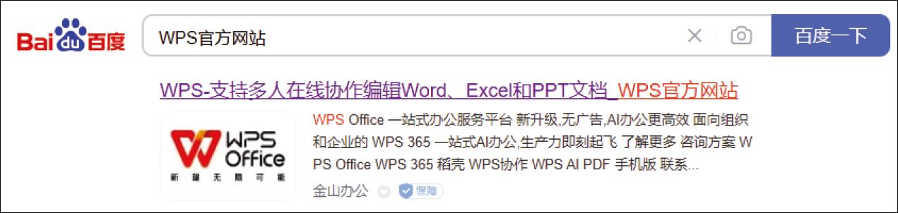 1 在百度网中搜索并打开名为“WPS官方网站”的网站。
