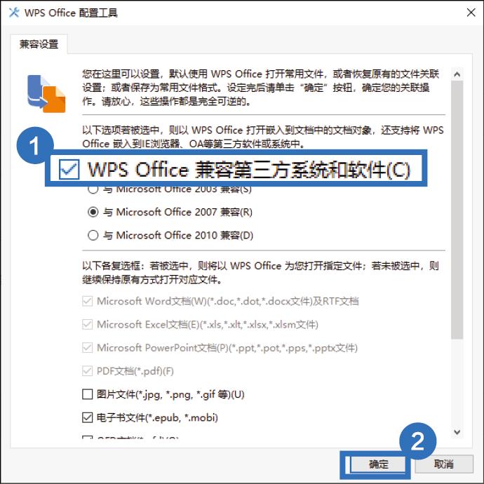 2 在弹出的【WPS Office配置工具】对话框中,勾选【WPS Office兼容第三方系统和软件】复选框,最后单击【确定】按钮完成设置。