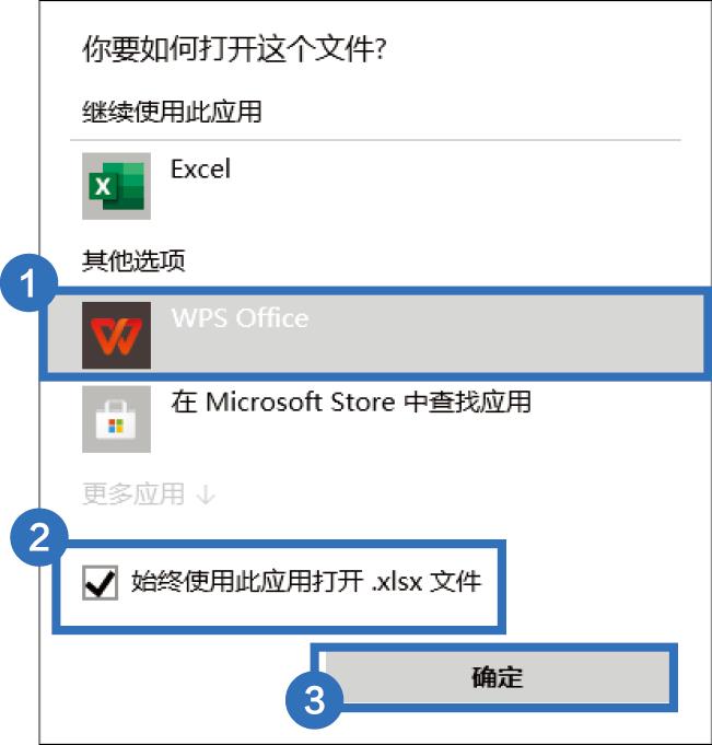 2 在弹出的对话框中选择【WPS Office】选项,勾选【始终使用此应用打开.xlsx文件】复选框,单击【确定】按钮完成设置。