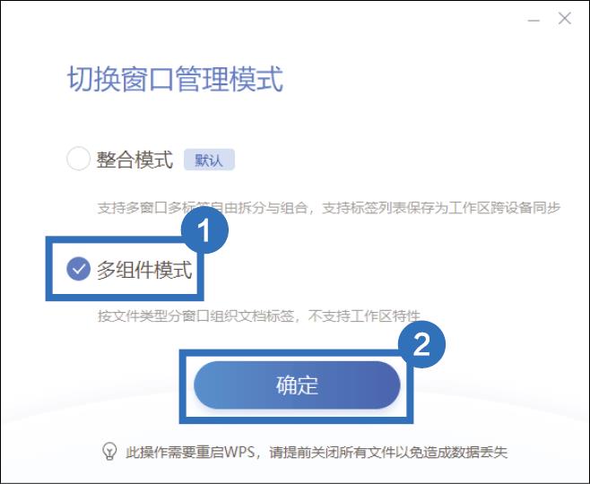 4 在弹出的对话框中选中【多组件模式】单选项后单击【确定】按钮。