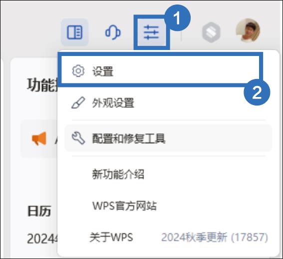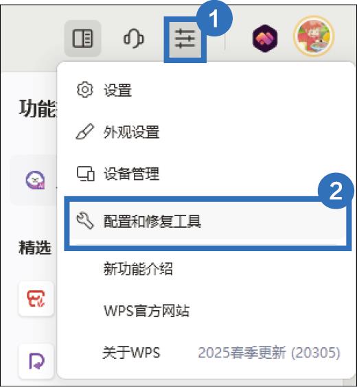 1 打开WPS Office后,单击【全局设置】按钮,在弹出的菜单中选择【配置和修复工具】命令。
