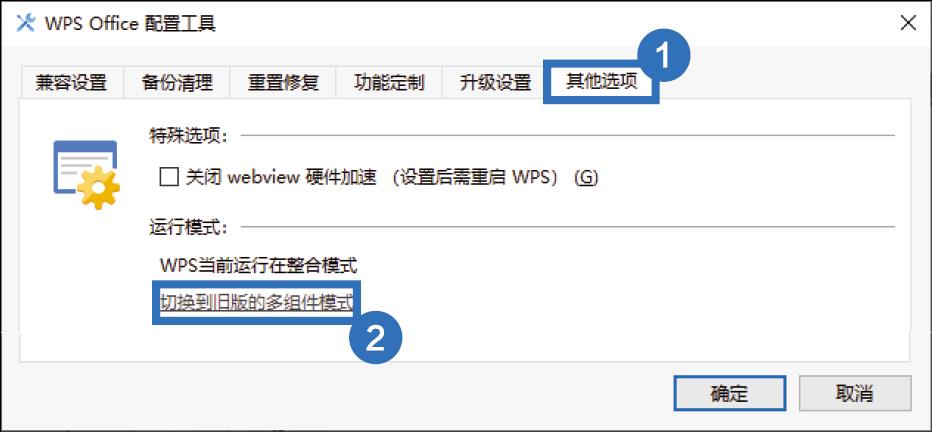 3 在弹出的【WPS Office配置工具】对话框中,切换到【其他选项】选项卡,选择最下方的【切换到旧版的多组件模式】选项。