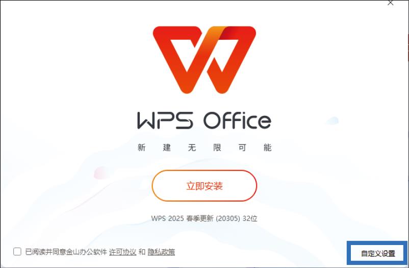 打开WPS Office安装程序之后,单击右下角的【自定义设置】按钮,展开自定义设置菜单。