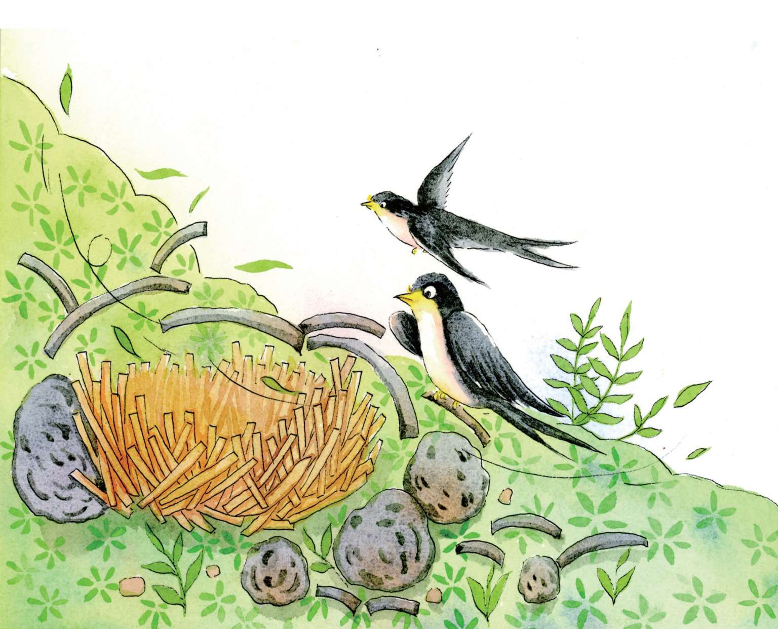 不知不觉,春天来了,一对年轻的燕子飞来了。他们在老房子的屋檐下做了个窝,后来,他们有了五个可爱的小宝宝。