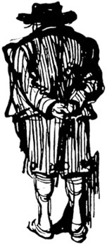 他老是同样的装束,从一七九一年以来始终是那身打扮。笨重的鞋子,鞋带也是皮做的;四季都穿一双呢袜、一条栗色的粗呢短裤,用银箍在膝盖下面扣紧,上身穿一件方襟的闪光丝绒背心,颜色一忽儿黄一忽儿古铜色,外面罩一件衣裾宽大的栗色外套,戴一条黑领带、一顶阔边帽子。他的手套跟警察的一样结实,要用到一年零八个月,为保持清洁起见,他有一个一定的手势,把手套放在帽子边缘上一定的地位。