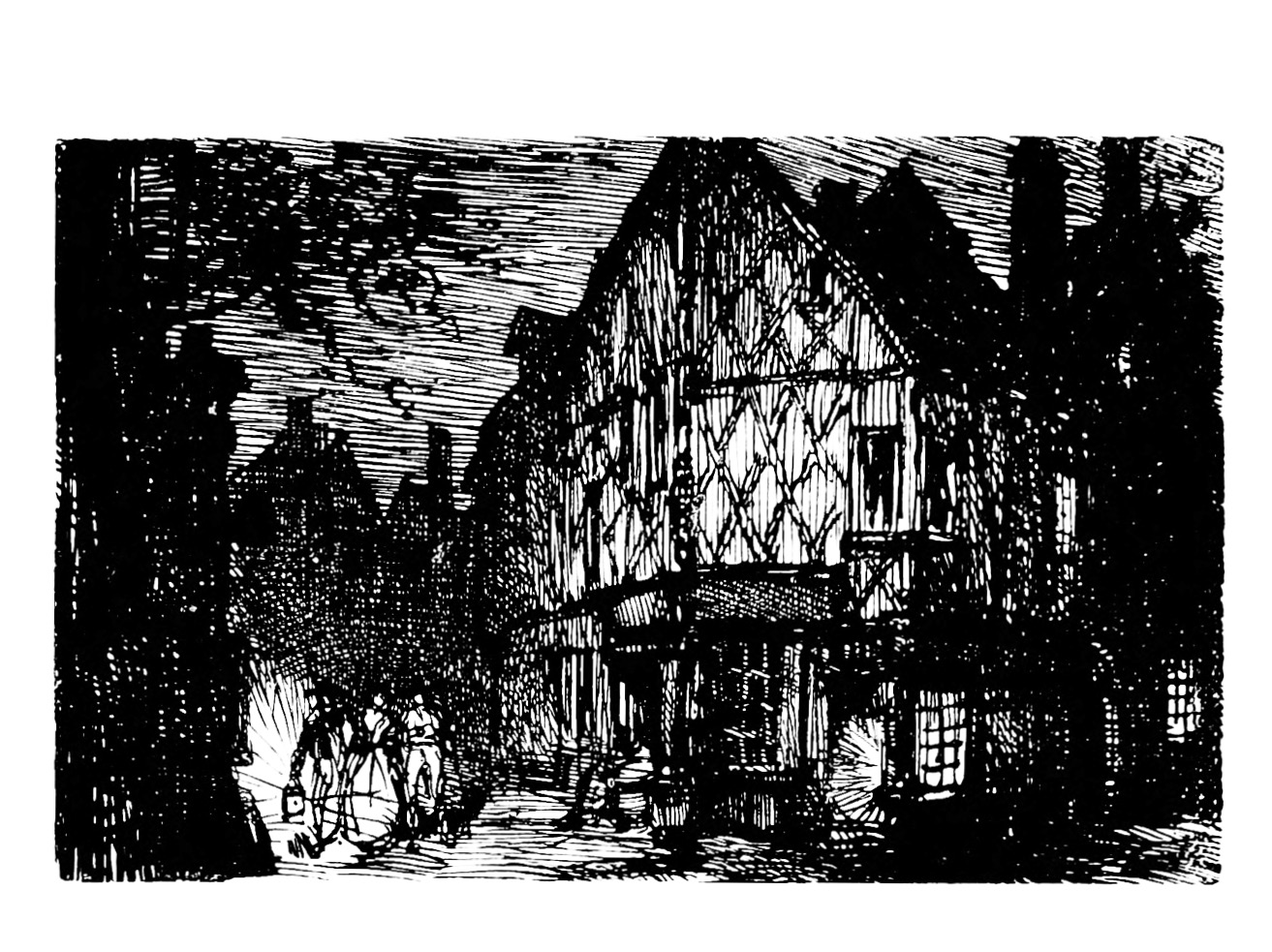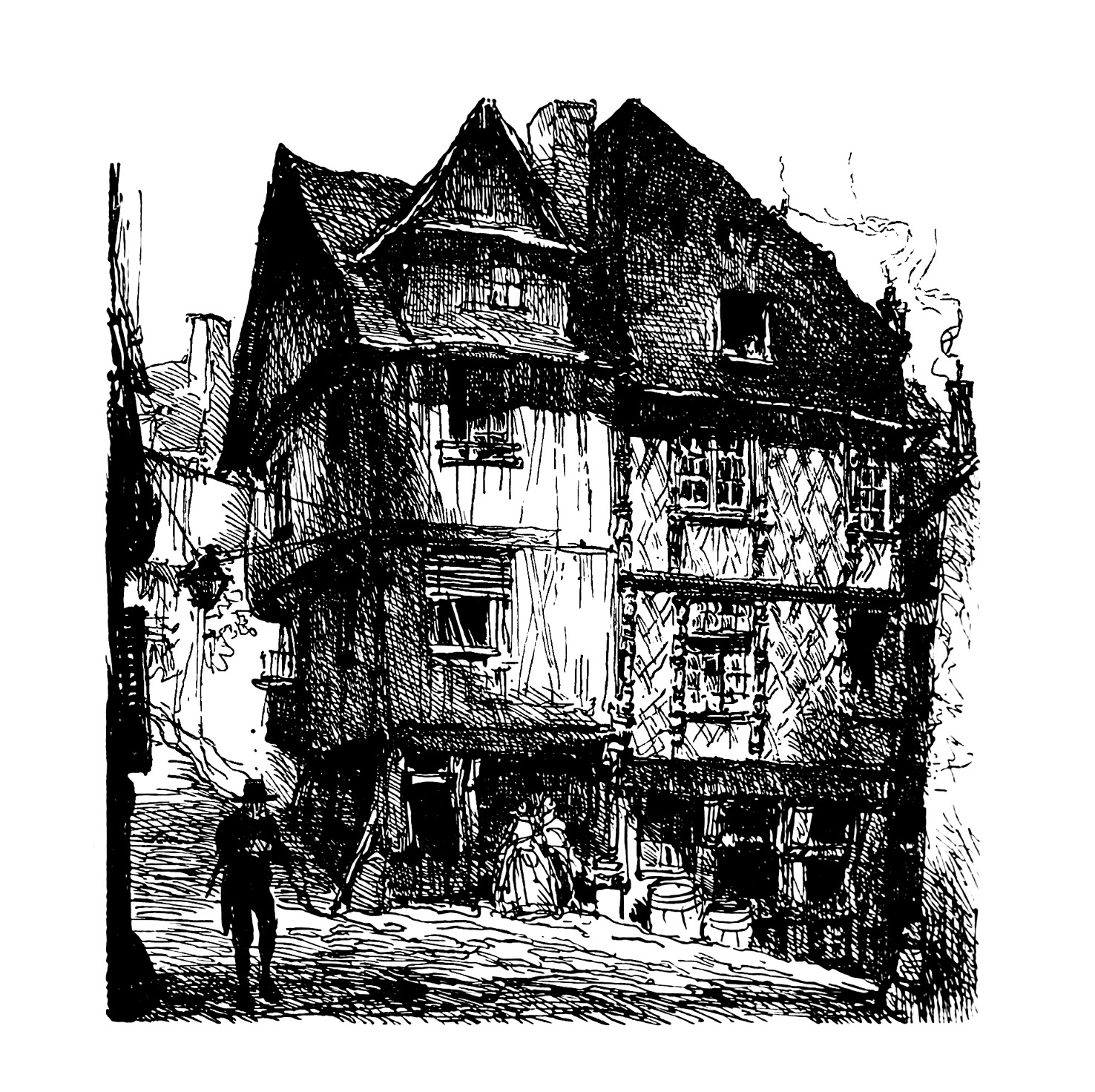 有些地方,屋子的横木盖着石板,在不大结实的墙上勾勒出蓝色的图案,木料支架的屋顶,年深月久,往下弯了;日晒雨淋,椽子已经腐烂,翘曲。有些地方,露出破旧黝黑的窗槛,细巧的雕刻已经看不大清,穷苦的女工放上一盆石竹或蔷薇,窗槛似乎就承受不住那棕色的瓦盆。再往前走,有的门上钉着粗大的钉子,我们的祖先异想天开地刻上些奇形怪状的文字,意义是永远没法知道的了:或者是一个新教徒在此表明自己的信仰,或者是一个旧教徒为反对新教而诅咒亨利四世。也有一般布尔乔亚刻些徽号,表示他们是旧乡绅,掌握过当地的行政。这一切中间就有整部法兰西历史的影子。一边是墙壁粉得很粗糙的、摇摇欲坠的屋子,还是工匠卖弄手艺的遗物;贴邻便是一座乡绅的住宅,半圆形门框上的贵族徽号,受过了一七八九年以来历次革命的摧残,还看得出遗迹。