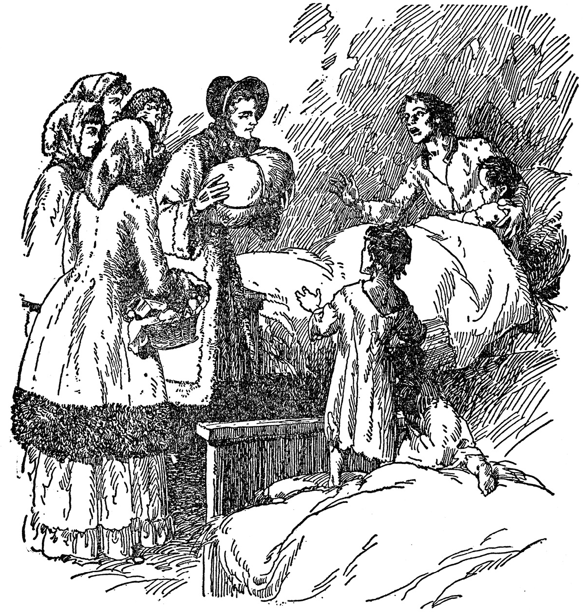 这是一间光秃秃的屋子,境况凄凉。窗户残破,室内没有炉火,被褥也破破烂烂。母亲缠绵病榻,婴儿嗷嗷啼哭,还有几个脸色苍白、饥肠辘辘的孩子挤在一条旧毯子下,抱团取暖。女孩们进屋时,那一双双大眼睛瞪得那样圆,冻得发紫的嘴唇露出了微笑。