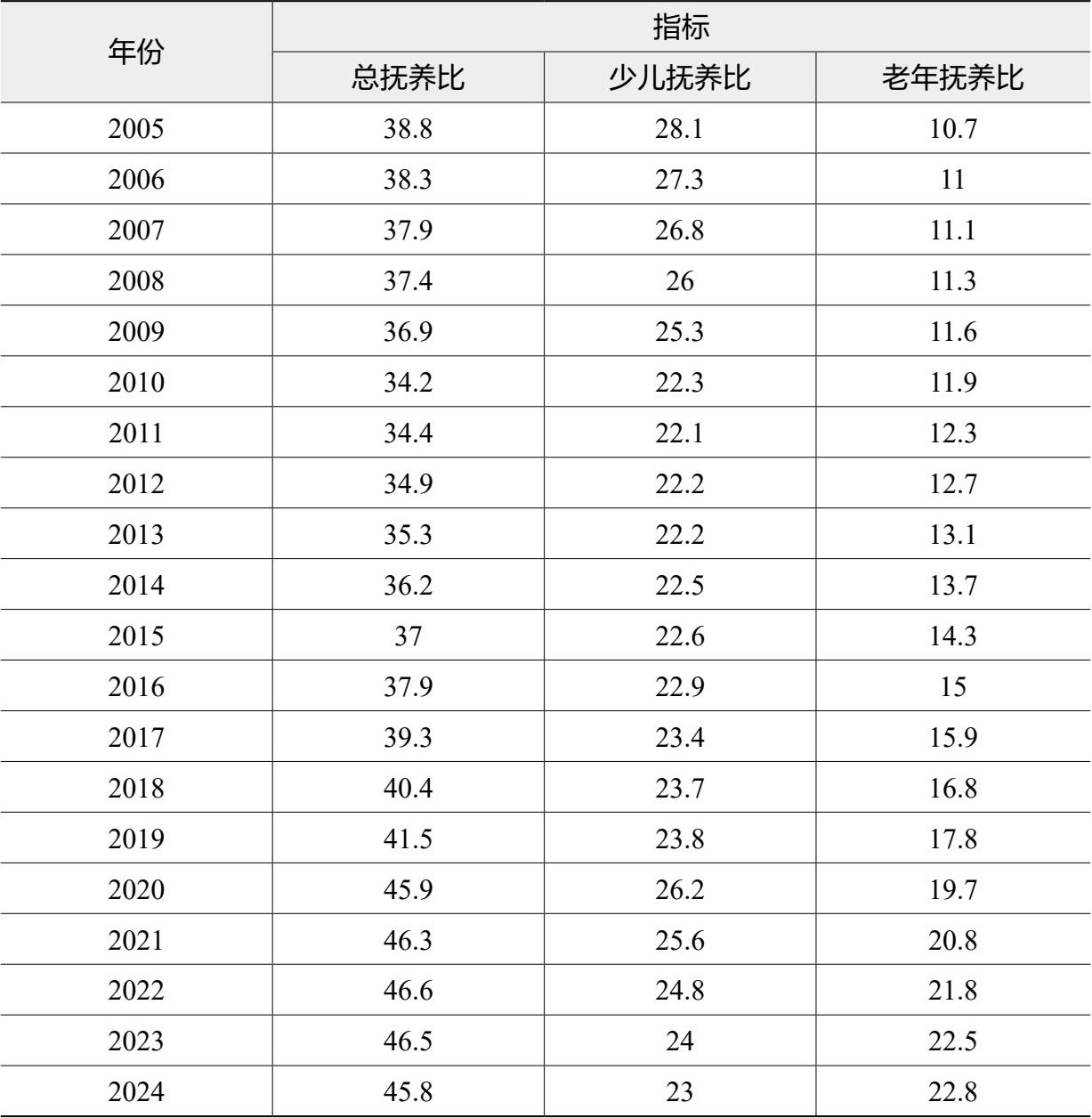 从1982年第三次人口普查到2020年第七次人口普查,我国人均家庭规模从4.41人下降至2.62人,低于“三口之家”的底线。人口老龄化叠加少子化,抚养比急剧提升将是大趋势,给我国人口问题、养老问题带来巨大挑战。解决人口老龄化和少子化带来的重压,人、财、物缺一不可,政策和制度准备需要超前,建设与人口老龄化进程相适应的民生大国迫在眉睫。2005—2024年我国的抚养比变化见表1.5。