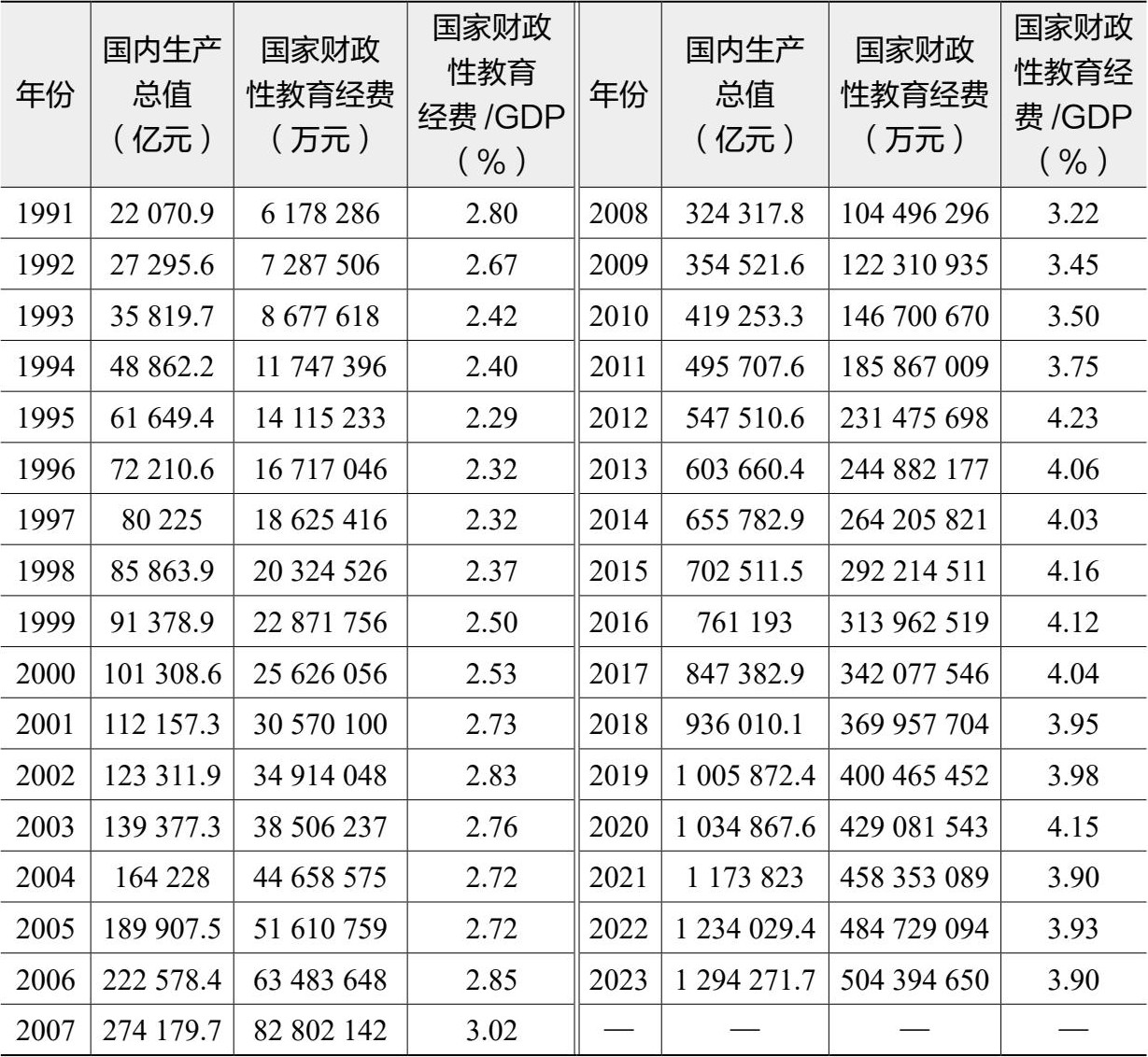 表1.6 1991—2023年我国财政性教育经费占国内生产总值的比例