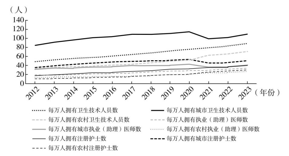 党的十九大报告提出,要在“病有所医”上不断取得新进展,要“完善国民健康政策,为人民群众提供全方位全周期健康服务”,并对健康中国战略的实施提出了一系列明确要求。这充分体现了我们党对健康在促进人的全面发展和经济社会协调发展中发挥重大作用的整体思路,也呼应了广大人民群众的急切期盼。2012—2023年每万人口卫生技术人员数见图1.3。