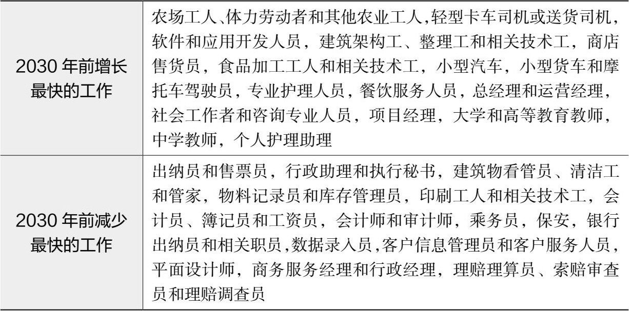 一方面,从短期看,收入增长和消费升级激活内需市场,将为新产业奠定需求基础;从中期看,依托数字经济,教育、健康投资积累人力资本,解决创新驱动的要素约束;从长期看,坚实的社保体系与有效的区域协调将有助于降低风险,保障新旧转换进程可持续。另一方面,若居民收入不稳、社保缺失、教育和医疗资源不足,将导致消费能力受限、人力资本积累不足,无法支撑新动能所需的消费市场与人才供给,动能转换必然受阻。脱离民生的动能转换既缺乏动力根基,也难获社会认同。例如,当前科技革命与技术进步正深刻改变全球各行各业,给就业形态和就业格局带来许多新问题。再如,世界经济论坛《2025年就业未来报告》显示,到2030年,将有22%的就业机会面临变革(见表1.4),被替代的工作岗位数量为9 200万个。